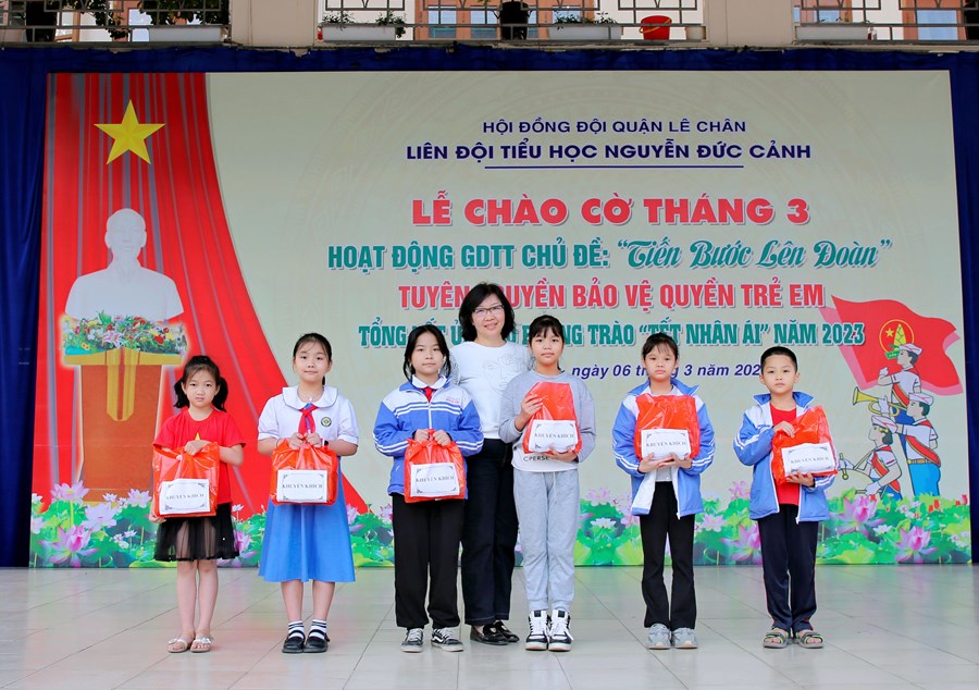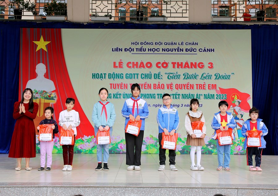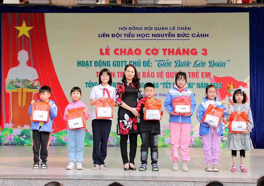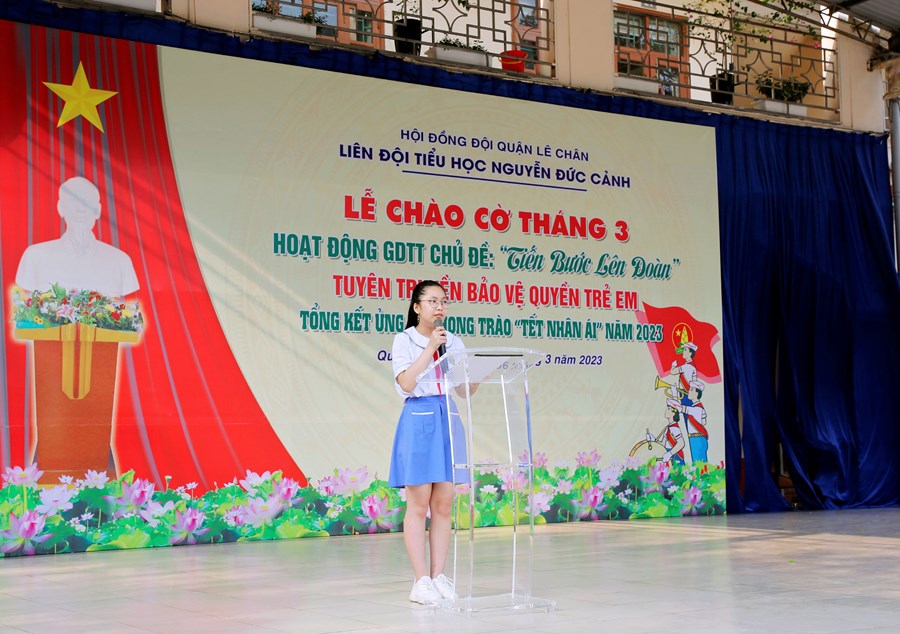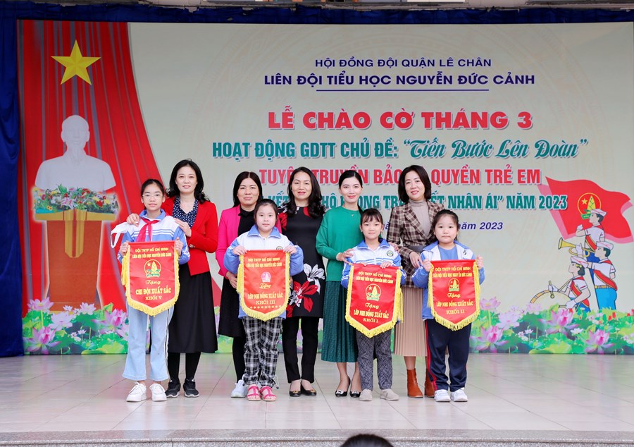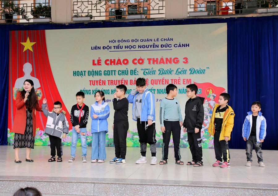 Ngày 06/3/2023, Liên đội Tiểu học Nguyễn Đức Cảnh đã tổ chức Hoạt động giáo dục tập thể tháng 3 với các nội dung: Chủ điểm “Tiến bước lên Đoàn”; Tuyên truyền Quyền bảo vệ trẻ em, phòng tránh xâm hại trẻ em; Tuyên truyền về sức khỏe và dinh dưỡng học đường; Tổng kết tham gia ủng hộ Phong trào “Tết Nhân ái” Xuân Quý Mão năm 2023.