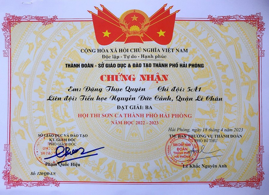 Trong ngôi trường Tiểu học Nguyễn Đức Cảnh, không ai là không biết đến bạn Đặng Thục Uyên lớp 5A1. Nhắc đến Quyên chúng ta nhớ ngay giọng hát trong trẻo, ngân nga của bạn. Quyên mang về cho mình giải Ba trong Hội thi Sơn ca cấp thành phố. Quyên không chỉ hát hay mà bạn còn là lớp phó học tập rất gương mẫu. Chúc Quyên sang ngôi trường mới toả sáng và phát huy hết khả năng vốn có của mình nhé!