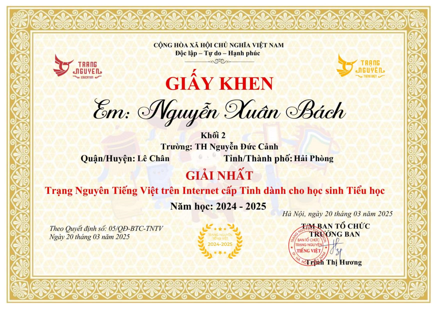 Trong vườn thành tích học tốt, rèn luyện tốt của Trường Tiểu học Nguyễn Đức Cảnh, Nguyễn Xuân Bách lớp 2A3 tỏa sáng như một bông hoa tiêu biểu. Bách là học sinh giỏi toàn diện, đặc biệt nổi bật ở ba lĩnh vực: Tiếng Việt, Toán học, và Tiếng Anh chính nhờ niềm đam mê học tập, tinh thần kỷ luật và phẩm chất khiêm nhường, luôn lắng nghe thầy cô và trao đổi cùng bạn bè. Với khả năng ngôn ngữ linh hoạt, tư duy mạch lạc và tình yêu sâu sắc với Tiếng Việt, Bách đã xuất sắc giành giải Nhất Trạng Nguyên Tiếng Việt cấp Quận và giải Nhất Trạng Nguyên Tiếng Việt cấp Thành phố – những thành tích đáng tự hào, ghi dấu sự bền bỉ và tinh thần cầu tiến. Không dừng lại ở đó, em còn thể hiện bản lĩnh vượt trội trong Toán học khi tham gia thành công Cuộc thi Toán khu vực phía Bắc do Mathnasium Hoa Kỳ tổ chức, khẳng định năng lực tư duy logic và sự nhanh nhạy vượt trội. Bên cạnh đó, Bách còn đạt thành tích Hoàn thành xuất sắc vòng thi cấp Quận Đấu trường VioEdu Tiếng Anh và Đấu trường VioEdu cấp Trường – cho thấy sự tiến bộ vượt bậc và tinh thần chủ động trong việc học ngoại ngữ từ sớm. Không chỉ học giỏi, Bách còn là học sinh gương mẫu của lớp 2A3: lễ phép với thầy cô, hòa đồng với bạn bè, sống giàu tình cảm và luôn sẵn sàng giúp đỡ người khác.