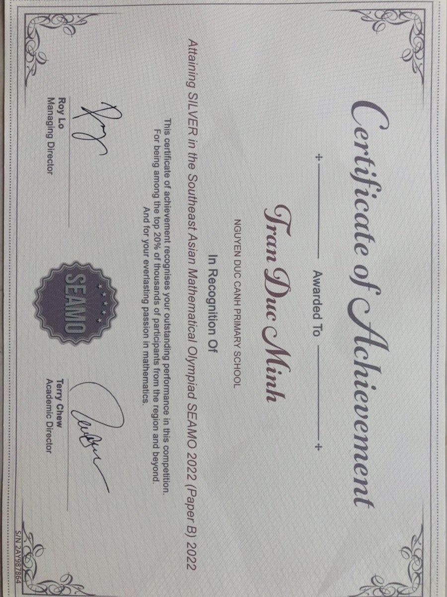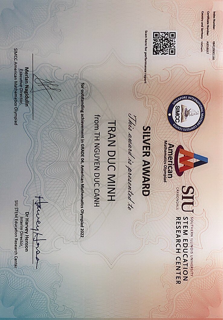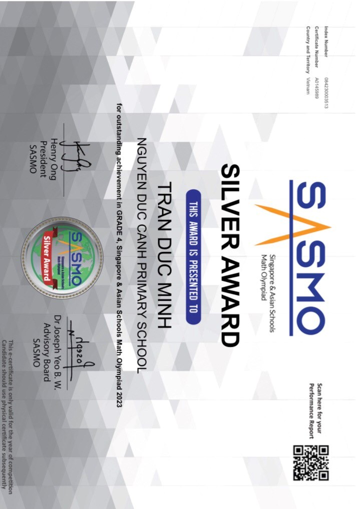 - Huy chương Bạc các cuộc thi Olympic Toán quốc tế SASMO, SEAMO, AMO.