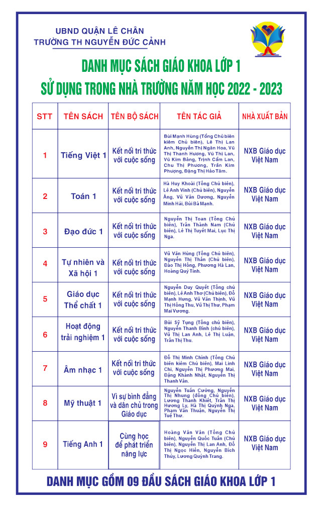 Căn cứ danh mục SGK lớp 1, lớp 2, lớp 3 đã được UBND thành phố phê duyệt tại các quyết định số 1089/QĐ-UBND ngày 14/4/2021 và quyết định số 1281/QĐ-UBND ngày 04/5/2022, trường TH Nguyễn Đức Cảnh trân trọng thông báo tới toàn thể cán bộ, giáo viên, nhân viên, cha mẹ học sinh và các em học sinh danh mục sách giáo khoa lớp 1, lớp 2 và lớp 3 sử dụng trong nhà trường năm học 2022 – 2023