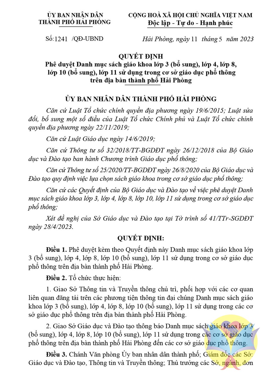 Ủy ban nhân dân TP Hải Phòng vừa ban hành Quyết định số: 1241/QĐ-UBND về việc phê duyệt Danh mục sách giáo khoa lớp 3 (bổ sung), lớp 4, lớp 8, lớp 10 (bổ sung), lớp 11 sử dụng trong cơ sở giáo dục phổ thông trên địa bàn thành phố Hải Phòng theo đề nghị của Sở Giáo dục và Đào tạo thành phố.