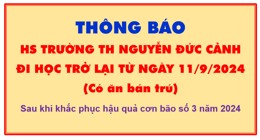 Vậy nhà trường trân trọng thông báo: NGÀY MAI, 11/9/2024 (Thứ Tư), học sinh Trường Tiểu học Nguyễn Đức Cảnh đi học trở lại. Hoạt động ăn bán trú diễn ra bình thường.