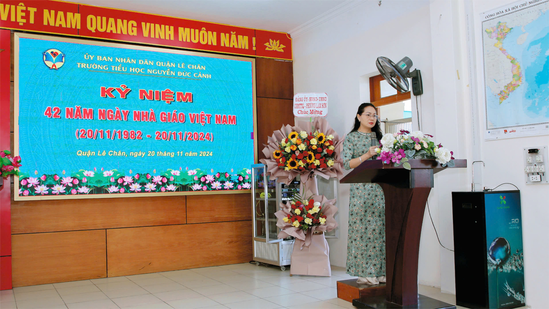 Trong dịp Kỷ niệm 42 năm Ngày Nhà giáo Việt nam lần này, nhà trường rất vui mừng khi được đón nhận những lẵng hoa tươi thắm chúc mừng của: Liên đoàn Lao động quận Lê Chân, Đảng ủy - HĐND - UBND - MTTQ phường Lam Sơn, Đảng ủy - HĐND - UBND - MTTQ phường An Dương, Công an phường An Dương, của Đ/c Vũ Thị Tố Nga - UV BTV Quận Ủy, Phó Chủ tịch HĐND Quận, Ban đại diện Hội cha mẹ học sinh nhà trường và của các Công ty, Trung tâm liên kết với nhà trường.