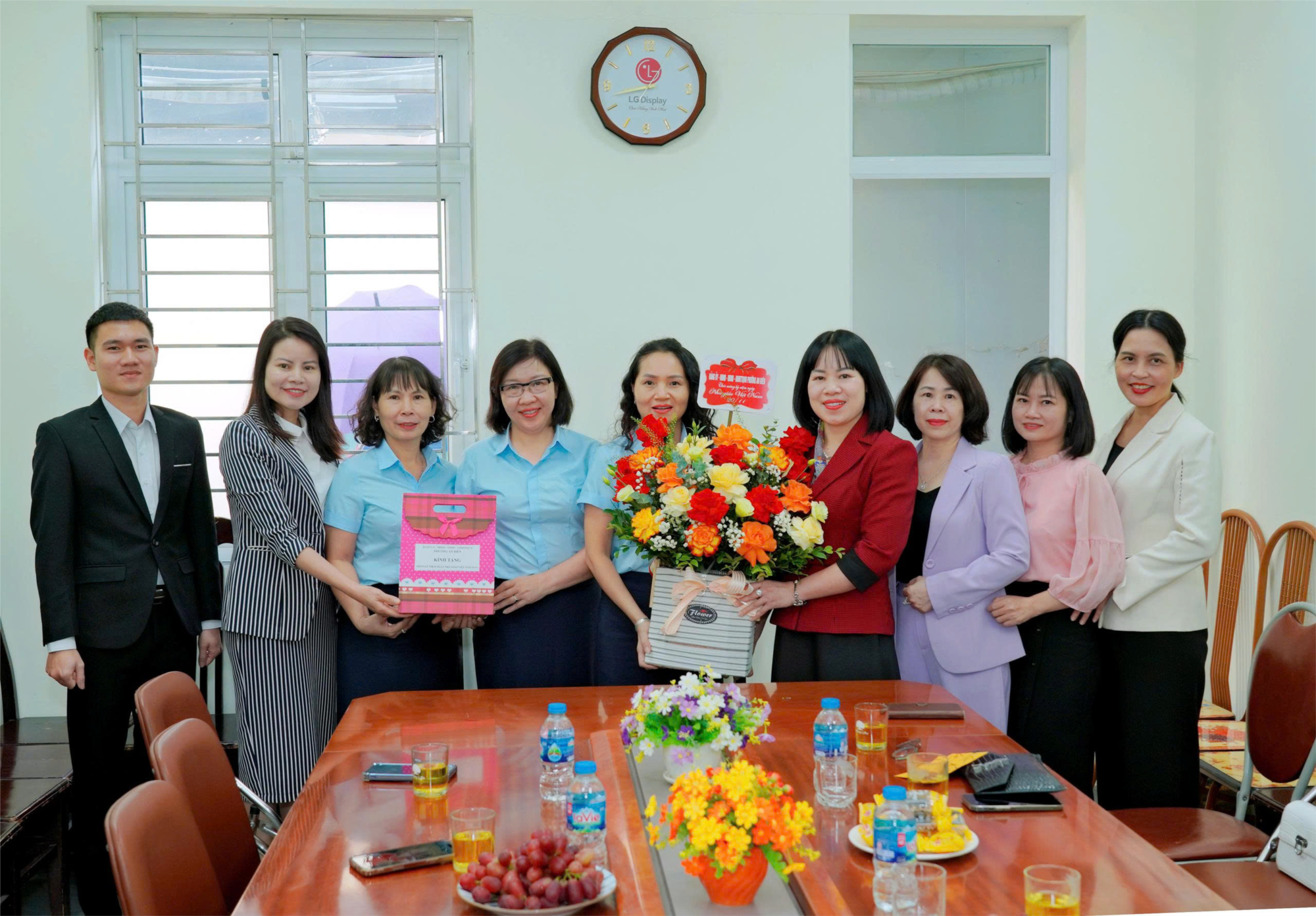 Đón tiếp đoàn lãnh đạo phường An Biên tới chúc mừng nhà trường, có Đ/c Phạm Thị Ngà - Bí thư Chi bộ, Hiệu trưởng; các Đ/c Phó Hiệu trưởng, Bí thư Chi đoàn GV và đại diện GV.
