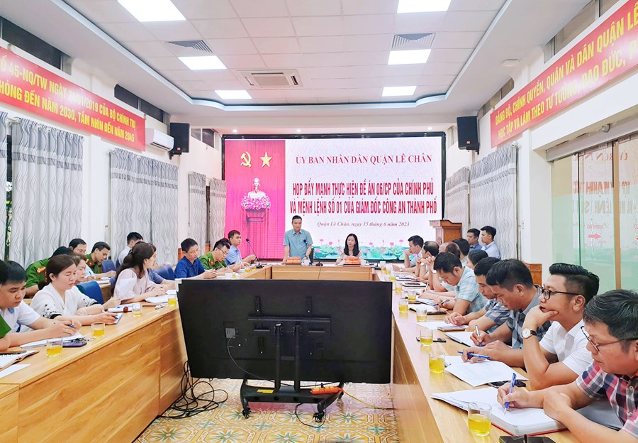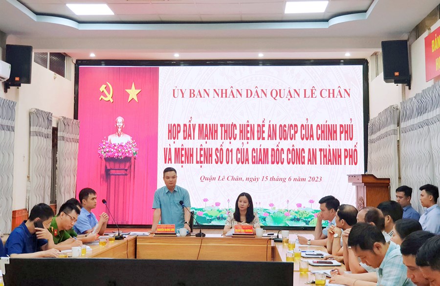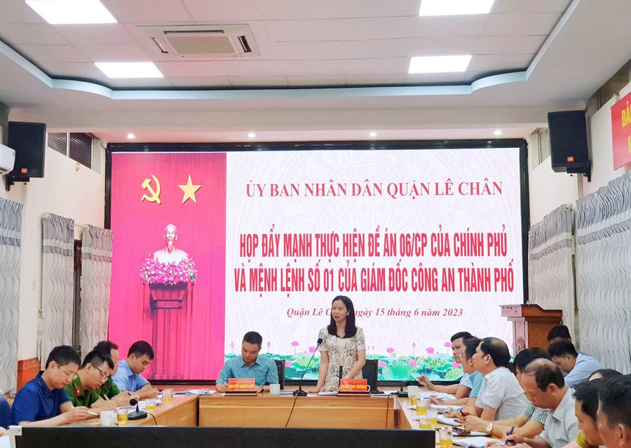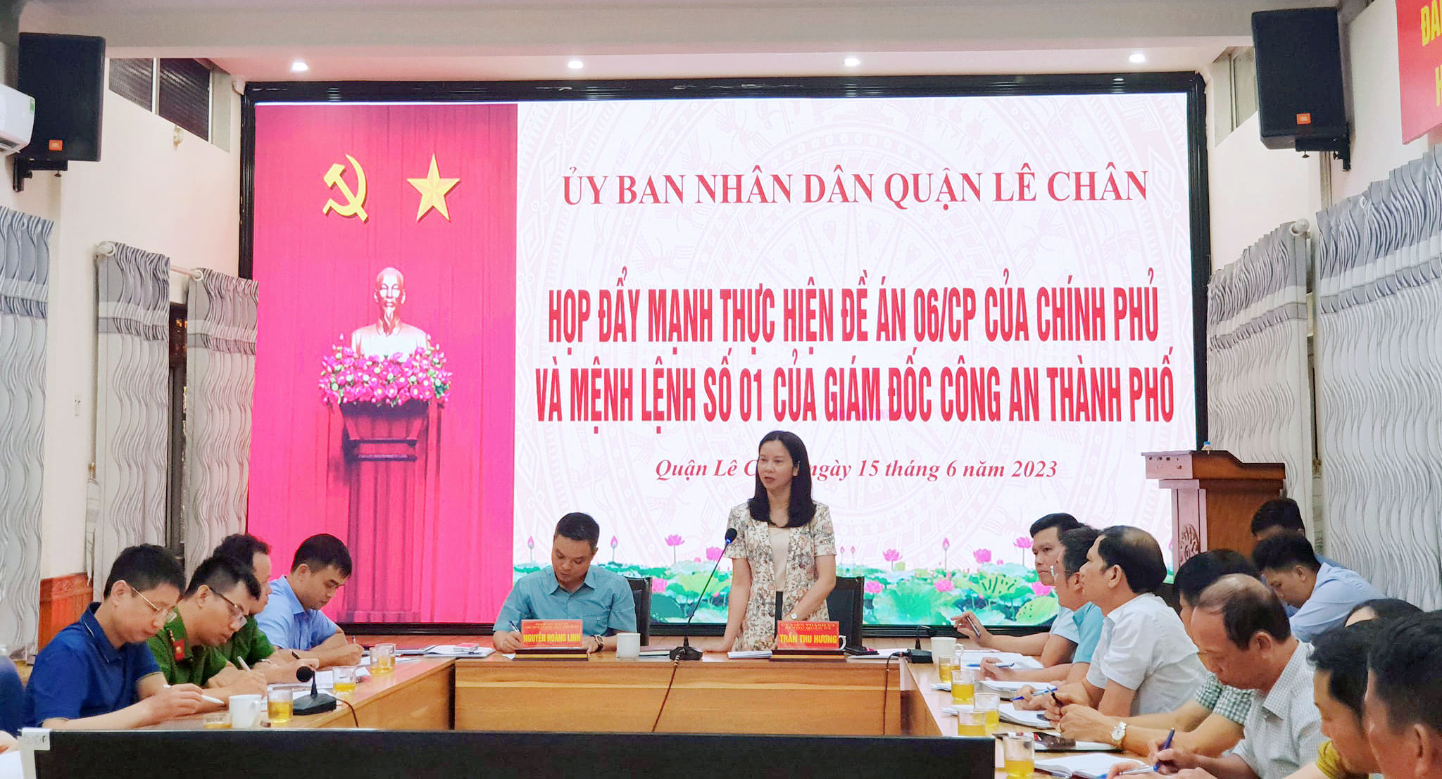Chiều ngày 15/6, Quận Lê Chân tổ chức Hội nghị họp bàn các biện pháp nhằm đẩy mạnh thực hiện Đề án 06/CP của Chính phủ và Mệnh lệnh số 01 của Giám đốc Công an Thành phố. Dự Hội nghị có các đồng chí: Trần Thu Hương – Ủy viên Thành ủy, Bí thư Quận ủy; Nguyễn Hoàng Linh – Phó Bí thư Quận ủy, Chủ tịch UBND quận; các đồng chí lãnh đạo UBND quận, Công an quận; Các đồng chí thành viên Ban chỉ đạo Đề án 06/CP quận; Bí thư Đảng ủy, Chủ tịch UBND 15 phường; và lãnh đạo Công an các phường...